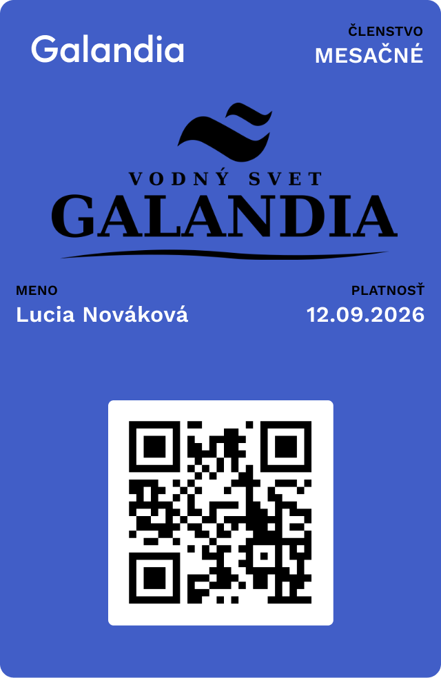 - Celodenné vstupy do Vodného sveta GALANDIA - Platné pre dospelú osobu, dieťa do 15 rokov, ZŤP, alebo seniora - Viazané na meno držiteľa – NEPRENOSNÉ - Členstvo je možné využiť preukázaním sa QR kódu a dokladom totožnosti, prípadne doklad o zvýhodnení - Počet vstupov Vodného sveta GALANDIA je neobmedzený maximálne však 1x za deň - Vstupné platné počas bežnej prevádzky Vodného sveta GALANDIA mimo špeciálnych podujatí